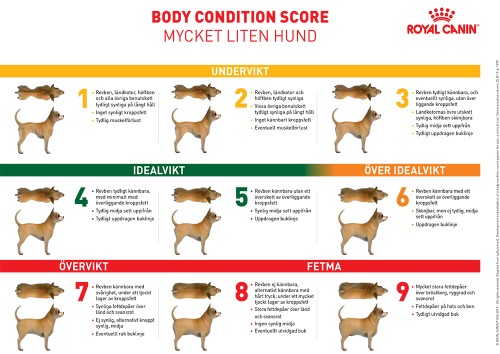 • Idealviktvikt: Revbenen är lätta att känna när du drar fingrarna över hunden, men de syns inte tydligt. Midjan och nacken är markerade.