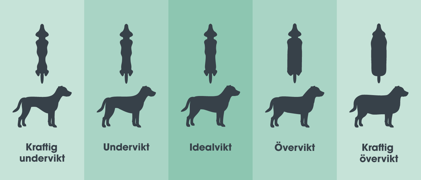 • Undervikt: Hundens revben syns tydligt och midjan är uppdragen. Hunden har nästan inget underhudsfett.