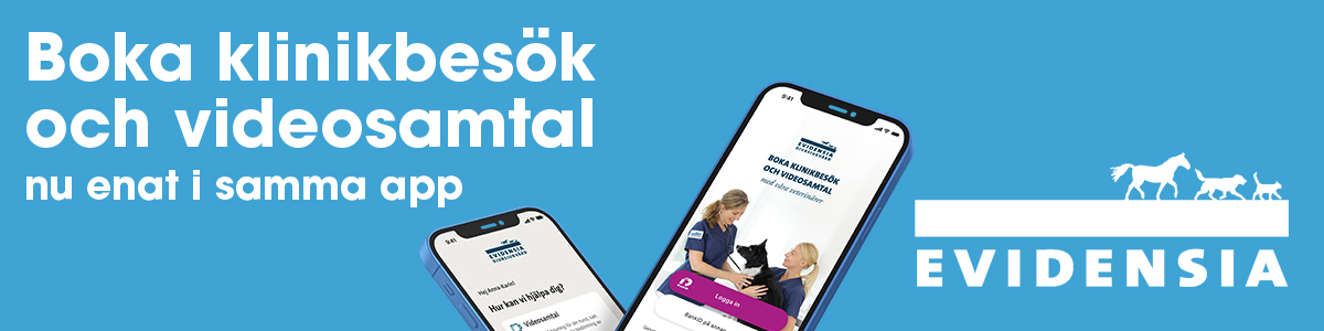 Med Evidensia-appen kan du enkelt boka både veterinärbesök på klinik och videosamtal med en av Evidensias veterinärer i mobilen eller surfplattan. Boka ditt veterinärbesök genom appen, oavsett tidpunkt eller var du och ditt djur befinner er. Via videosamtal med veterinär kan du få rådgivning och rekommendationer, diagnos av ditt djurs hälsoproblem eller förskrivning av lättare receptbelagda läkemedel utifrån veterinärens bedömning. Om ditt djurs fall är brådskande kan onlineveterinären bedöma hur akut läget är, remittera till lämplig klinik eller specialist samt informera om hur du kan hjälpa ditt djur tills dess att ni kommit till kliniken. Läs mer här >>
